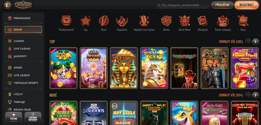 Živé casino je obzvláště působivé – kromě klasických variant rulety a blackjacku nabízí i originální gameshow hry jako Crazy Time nebo Monopoly Live. Všechny hry jsou optimalizované pro mobilní zařízení a mnoho z nich lze vyzkoušet v demo režimu. Platforma umožňuje rychlé filtrování podle vývojáře, žánru nebo popularity. Jedinou nevýhodou je absence některých menších a novějších studií, která najdete jinde, ale celkově je herní knihovna Gransino na špičkové úrovni a uspokojí i náročné hráče.