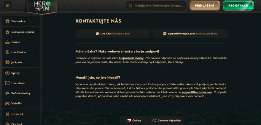 Live chat reaguje během několika minut, emailová podpora (support@herospin.com) odpovídá většinou do několika hodin. Čeští hráči ocení, že komunikace může probíhat i v češtině, což není u všech online casin běžné.