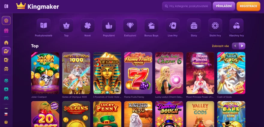 KingMaker Casino se pyšní rozmanitou nabídkou her od předních vývojářů a přívětivým uživatelským prostředím. Hned po vstupu do lobby si hráči mohou vybrat z tisíců titulů, které jsou přehledně rozděleny podle kategorií a poskytovatelů. Navigace je intuitivní a casino umožňuje efektivní filtrování her podle názvu, výrobce i herního žánru.