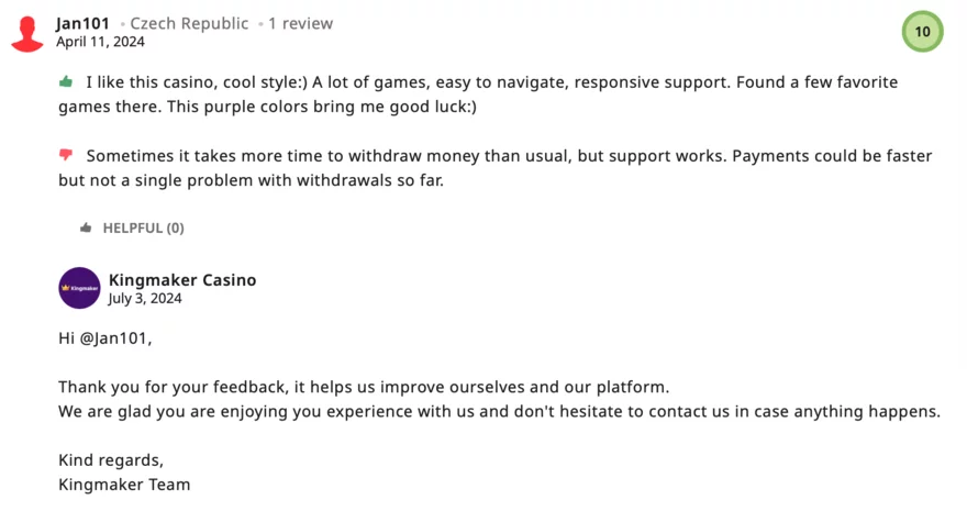 Při zkoumání online fór a recenzí na konkurenčních webech lze nalézt jak pozitivní, tak negativní zpětnou vazbu od hráčů. Někteří hráči si stěžovali na zpoždění výběrů či komplikace při ověřování účtů, zatímco jiní oceňovali širokou nabídku her a uživatelsky přívětivé rozhraní. Na AskGamblers si Kingmaker casino vysloužilo hodnocení 4.8/10 od hráčů, zatímco na CorrectCasinos získalo Trust Score 7.4/10.