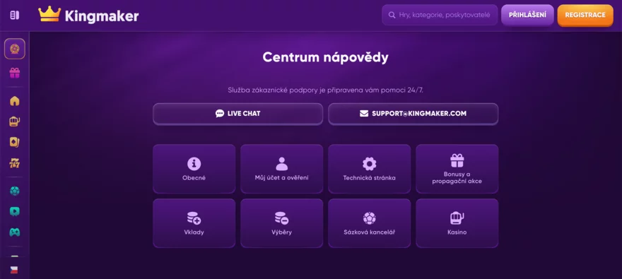 KingMaker Casino nabízí zákaznickou podporu dostupnou 24/7 prostřednictvím live chatu a e-mailu na adrese support@kingmaker.com. Českým hráčům vychází vstříc lokalizovanou podporou v češtině, což usnadňuje řešení problémů bez jazykové bariéry.