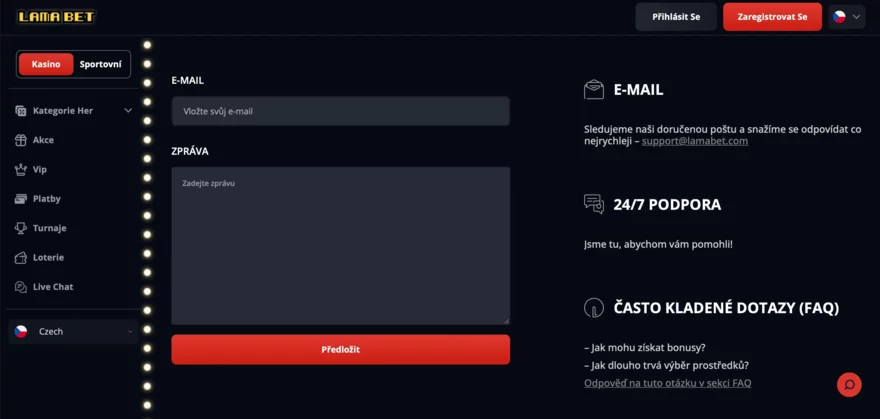 Podpora Lamabet Casino je dostupná 24 hodin denně, 7 dní v týdnu. Nejrychlejší kanál je online chat, kde odpověď přichází prakticky okamžitě. Chat je dostupný i v češtině, takže hráči mohou komunikovat bez jazykových bariér. Kromě chatu lze využít e-mail nebo online formulář pro méně urgentní dotazy. Operátorů je dostatek a komunikace je profesionální a vstřícná. Casino také striktně dodržuje pravidla GDPR: osobní údaje se používají pouze k vyřízení požadavků a jsou chráněny šifrováním.