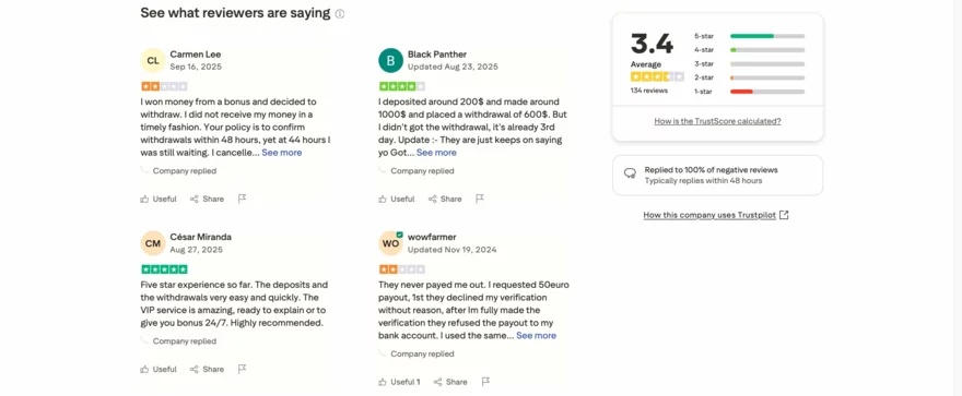Podmínky a bezpečnost: Někteří hráči poukazují na rozsáhlé smluvní podmínky a delší ověřovací proces, který může zpomalit zahájení hry. Celkově ale hodnotí pozitivně index bezpečnosti a férovost platformy. Oceňují rozmanité platební metody a stabilitu výplatních procedur.