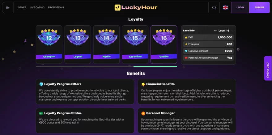 LuckyHour Casino nabízí exkluzivní VIP program, který je navržen tak, aby odměňoval věrné hráče za jejich pravidelnou hru. VIP program je rozdělen do několika úrovní, přičemž každá úroveň přináší další výhody a odměny. Hráči mohou postupovat v úrovních sbíráním věrnostních bodů, které získávají za každou sázku, kterou umístí ve hrách o skutečné peníze.