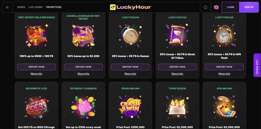LuckyHour Casino nabízí širokou škálu bonusů a promoakcí, které přitahují nové hráče a udržují zájem stávajících hráčů. Pro nové hráče je připraven uvítací balíček, který zahrnuje bonusna první vklad.