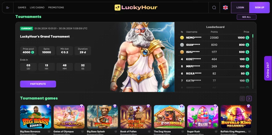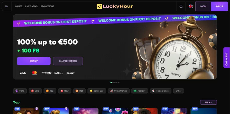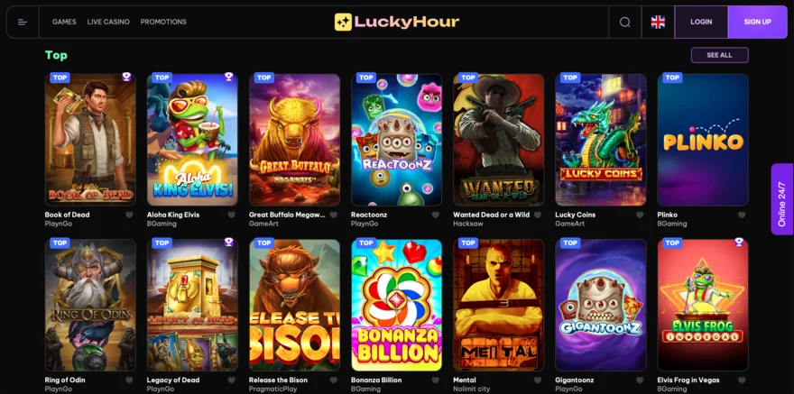 LuckyHour Casino se může pochlubit impozantním výběrem her, který zahrnuje více než 7,500 titulů od více než 80 renomovaných poskytovatelů softwaru. Tato rozmanitost zajišťuje, že si každý hráč najde něco podle svého gusta. Mezi hlavní kategorie her patří online automaty, stolní hry, Live casino hry a speciální hry.