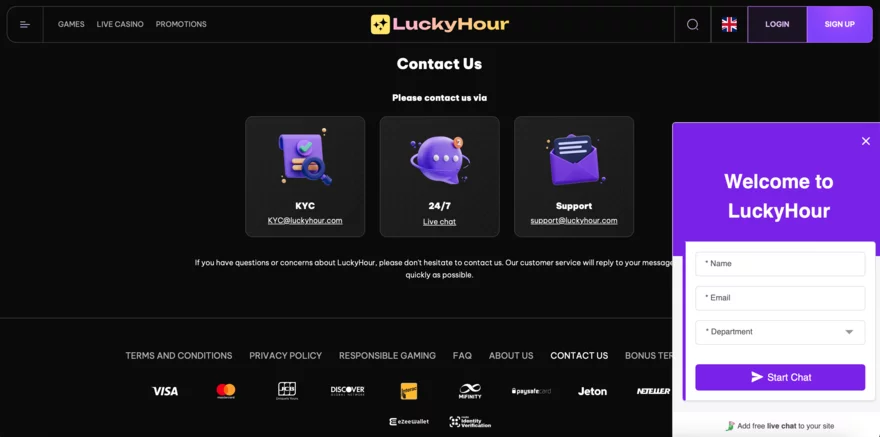 LuckyHour Casino klade velký důraz na poskytování kvalitní zákaznické podpory, která je k dispozici 24/7. Hráči mohou kontaktovat tým podpory prostřednictvím několika kanálů, což zajišťuje, že všechny dotazy a problémy budou řešeny rychle a efektivně. Bohužel casino nenabízí možnost komunikace v češtině, ale podporuje většinu světových jazyků, jako je angličtina, němčina, a další.