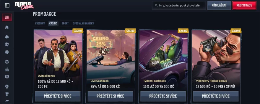 Mafia Casino umí hráče motivovat i po prvním vkladu. Od pondělí do čtvrtka lze využít Weekly Reload Bonus, který při vkladu od 500 Kč přináší 50 volných zatočení. O víkendu je nabídka ještě lákavější – Weekend Reload Bonus nabízí 50% bonus až do výše 17 500 Kč + 50 free spinů, s obdobnými podmínkami jako u vstupního balíčku (wagering 35x bonus + 40x spiny). Tyto pravidelné akce podporují věrnost a dávají hráčům možnost neustále navýšit herní rozpočet.