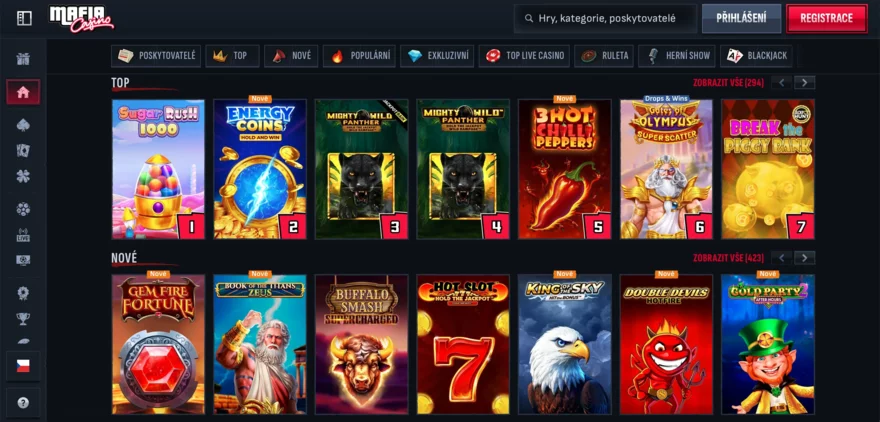 Mafia Casino boduje silným startem – přestože je na trhu nově, hráčům nabízí více než 7 500 her, což je výjimečné číslo i ve srovnání se zavedenými online casiny. Velké plus si zaslouží přehledné členění herní lobby do kategorií jako “Top”, “New”, “Popular”, které hráčům usnadňují orientaci. Pozitivně hodnotíme i možnost filtrovat hry podle poskytovatele, což značně zjednodušuje vyhledávání oblíbených titulů nebo objevování nových studií.