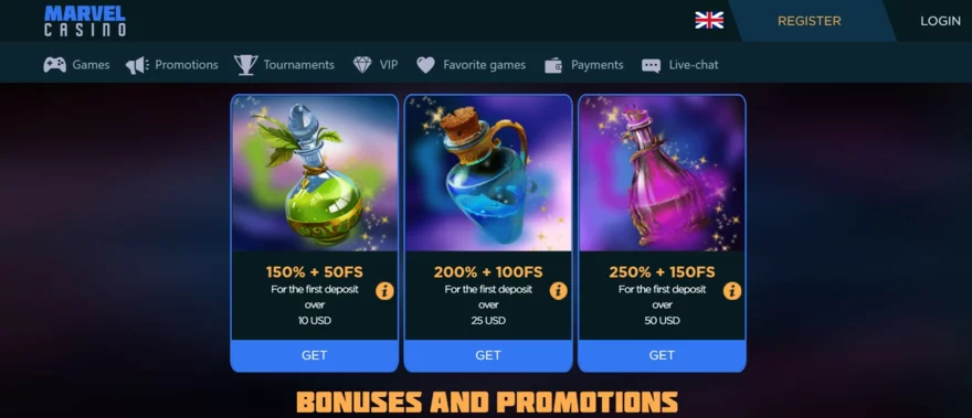 Hlavním tahákem jsou však vkladové bonusy. Uvítací balíček Marvel Casina je rozdělen do tří variant podle výše prvního vkladu, což ocení drobní hráči i high-rolleři: