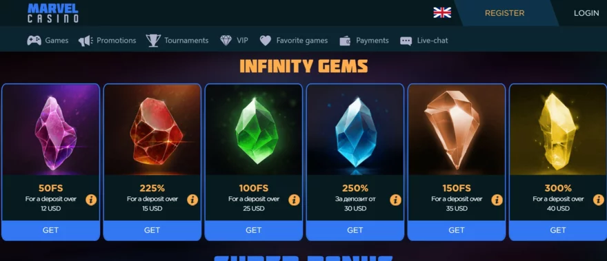 Zajímavostí Marvel Casina je tematická řada promoakcí Infinity Stones (Kameny nekonečna). V rámci těchto bonusů, pojmenovaných podle mocných kamenů z komiksů, mohou hráči získat extra odměny k vkladům: