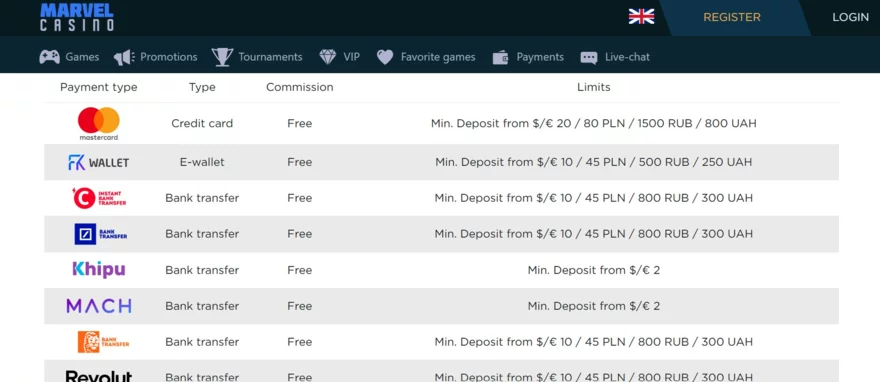 Při hraní o skutečné peníze je klíčové, aby kasino nabízelo spolehlivé platební metody s rozumnými limity. Marvel Casino v tomto směru nezklame – hráči mají na výběr širokou škálu možností pro vklady i výběry.