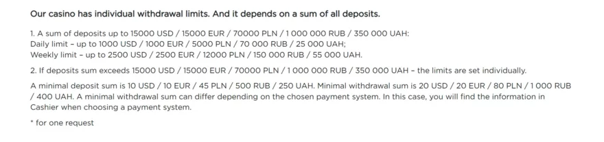 Díky tomu si mohou hráči zvolit takovou metodu, která jim nejvíce vyhovuje, ať už preferují korunové platby kartou, rychlé transakce přes e-wallet nebo anonymitu kryptoměn. Minimální limit pro vklady je velmi přívětivý, začíná už na 5 USD (cca 110 Kč) pro většinu platebních metod, což umožňuje vyzkoušet kasino i opatrně s malou částkou.