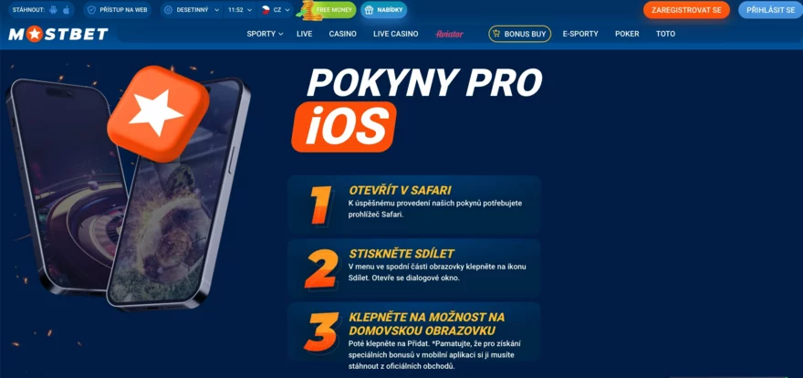Pro zařízení iPhone a iPad je aplikace dostupná jako zástupce na domovské stránce. Stačí si otevřít stránku Mostbet v mobilním prohlížeči, kliknout na možnost "Sdílet", a vybrat "Přidat na domovskou obrazovku".