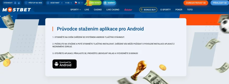 Aplikace není na Google Play, proto si stáhněte APK soubor z oficiálních stránek Mostbet. V nastavení telefonu povolte instalaci z neznámých zdrojů, aby bylo možné aplikaci nainstalovat. Po stažení otevřete APK soubor a dle průvodce jej nainstalujte do zařízení. Aplikace je kompatibilní s většinou moderních Android zařízení.
