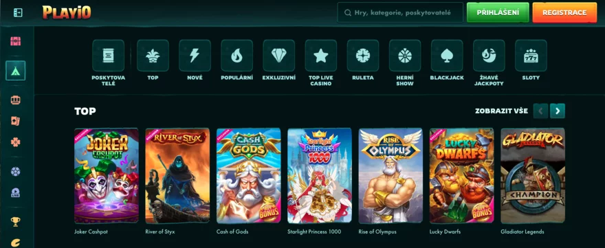 Navigace na stránkách Playio je velmi intuitivní. Hlavní menu se nachází na boku nebo v horní části stránky (podle zařízení), kde rychle najdete kategorie jako Hry, Akce, Turnaje, VIP klub, Nápověda nebo Můj účet. Využít můžete také vyhledávací pole a filtry podle typu hry nebo poskytovatele.