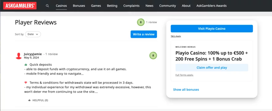 Na fórech a konkurenčních webech, jako je AskGamblers, má Playio Casino většinou pozitivní recenze (8/10). Stížnosti hráčů jsou řešeny konstruktivně a společnost se snaží problémy rychle a efektivně řešit. Transparentní a férový přístup k hráčům je jedním z důvodů, proč má casino vysoké hodnocení důvěryhodnosti.