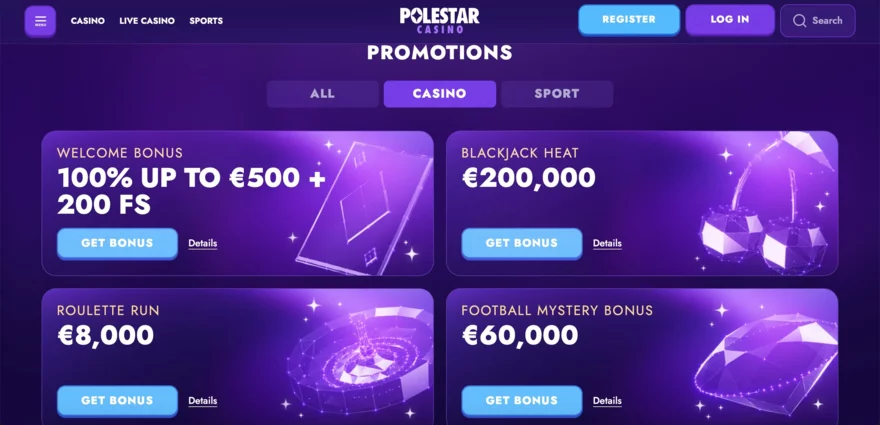 PoleStar Casino nabízí velmi atraktivní bonusovou nabídku. Noví hráči získají 100 % až do €500 a 200 free spinů, přičemž minimální vklad činí €20–30. Podmínky protočení jsou 35x vklad i bonus a platí po dobu 10 dní. Výhodou je vysoký limit sázky při hraní s bonusem – až €7,50.