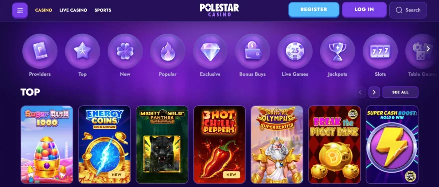 PoleStar spolupracuje s více než 85 herními vývojáři, včetně špičkových jmen jako NetEnt, Pragmatic Play, Red Tiger, Evolution, Play’n GO, Quickspin nebo Yggdrasil. Hráči tak mají přístup nejen ke klasickým automatům, ale i ke slotům s funkcí Bonus Buy, moderním Megaways titulům nebo exkluzivním hrám dostupným pouze na tomto webu. Všechny sloty a stolní hry jsou dostupné v režimu „free2play“, takže si je můžete vyzkoušet zdarma. Nabídka her jerozdělená do přehledných kategorií, což pomáhá hráčům snadno najít své oblíbené tituly.