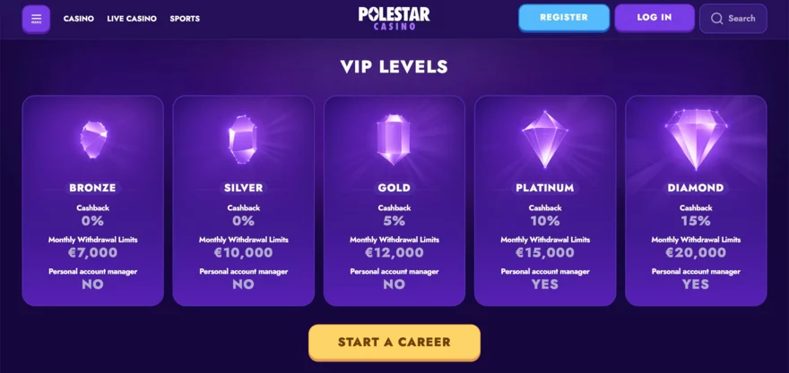PoleStar Casino nabízí propracovaný VIP program s pěti úrovněmi, který odměňuje loajalitu lepšími limity, osobní podporou a exkluzivními nabídkami. No deposit bonus aktuálně dostupný není, což je menší nevýhoda. Na druhou stranu hráči mohou soutěžit v turnajích a výzvách o bonusy a ceny, což motivuje k dlouhodobému hraní.