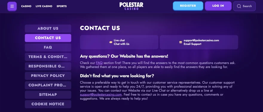 PoleStar Casino poskytuje zákaznickou podporu 24/7 prostřednictvím live chatu a e-mailu, což je velmi pozitivní. Nejrychlejší způsob, jak získat pomoc, je právě live chat, který nevyužívá chatbota, ale přímé spojení s agentem. Pokud není agent okamžitě k dispozici, systém vás zařadí do krátké fronty. Na e-mailové dotazy reagují operátoři většinou do několika hodin, což je v rámci online casin běžný standard. Telefonická podpora chybí, stejně jako možnost kontaktu přes sociální sítě nebo funkce zpětného volání. Pro kontakt e-mailem můžete využít adresu support@polestarcasino.com.