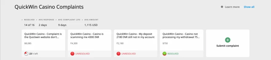 Na platformách jako AskGamblers nebo Trustpilot se objevují smíšené recenze. Zatímco někteří hráči chválí rychlost výplat a kvalitu zákaznické podpory, jiní si stěžují na zpoždění při výběrech nebo problémy s připsáním vkladů. Je však důležité zmínit, že většina stížností je konstruktivní a casino se snaží problémy řešit. Například na AskGamblers lze najít případy, kdy byly výběry úspěšně vyřešeny po zásahu podpory. zpětnou vazbu, recenze a konkrétní stížnosti hráčů na kasino QuickWin a kasina se stejným managementem