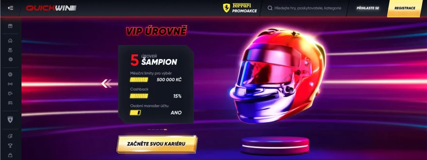 QuickWin Casino nabízí pětistupňový VIP program, který odměňuje aktivní hráče za pravidelnou hru, vklady i účast v promoakcích. VIP úrovně jsou: Nováček, Amatér, Expert, Mistr a Champion. Do programu se zapojíte automaticky – stačí hrát o skutečné peníze a sbírat věrnostní body. Ty získáváte za každých 2 500 Kč prosázených na automatech nebo ve sportovních sázkách, navíc za každý vklad dostanete bonus 5 % jeho hodnoty v bodech.