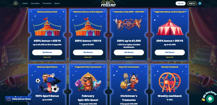 Rollino Casino pravidelně organizuje promoakce jako Spin Win Quest s prize poolem €20,000 a Treasures Tournament s výhrou až €10,000. Tyto turnaje od Pragmatic Play a Play’n Go motivují hráče k vyšším výhrám díky leaderboard systému. Nechybí ani VIP program s cashbackem až do 25 % v závislosti na úrovni hráče. V současné době casino nabízí exkluzivní no deposit bonus skrze registraci na našich stránkách, díky kterému získáte 20 free spinů bez vkladu na populární automat Sweet Bonanza.