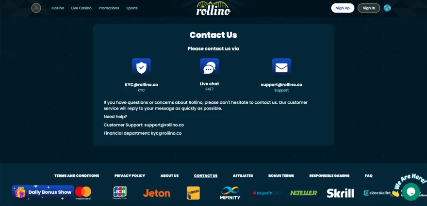 Zákaznická podpora v Rollino casinu je snadno dostupná a nabízí několik způsobů, jak kontaktovat tým. Podpora je k dispozici 24/7, což zaručuje, že hráči mají pomoc vždy po ruce. Pro registrované uživatele je k dispozici online chat, který je velmi pohodlný a rychlý. Odpovědi jsou obvykle poskytovány do 3 minut, což je pozitivní. Pokud nejste registrováni, můžete využít emailovou podporu na adrese support@rollino.com, nebo navštívit FAQ sekci.