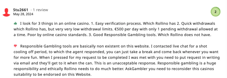 Online recenze Rollino jsou smíšené. Na portálu CorrectCasinos má casino skóre důvěryhodnosti 4,9/10 s varováním „Buďte opatrní“, zatímco na AskGamblers dosáhlo průměrného hodnocení 3,9/10. Nejčastější stížnosti hráčů se týkají dlouhé doby zpracování výběrů a nekvalitní zákaznické podpory. Někteří hráči si však pochvalují širokou nabídku her a moderní design platformy.