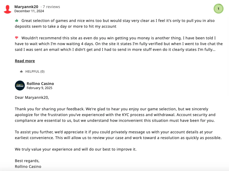 Co se týče bezpečnosti, Rollino využívá SSL certifikát k šifrování dat, což znamená, že osobní i finanční údaje hráčů jsou chráněny proti neoprávněnému přístupu. Ochrana hráčů však není dostatečně propracovaná – casino nabízí možnost dočasné nebo trvalé deaktivace účtu, ale chybí detailnější informace o nástrojích pro zodpovědné hraní. Hráčům doporučuje organizace jako GamCare, Gambling Therapy a Gamblers Anonymous, avšak rozsah aktivní podpory není zcela transparentní.