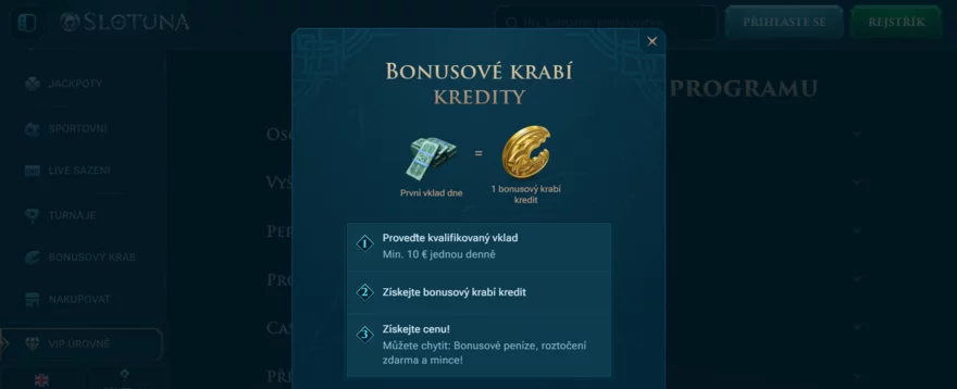 Slotuna casino rozhodně ví, jak přivítat nové hráče. Jejich vstupní bonus dosahuje až 12 500 Kč a jako třešnička na dortu na vás čeká 200 free spinů a 1 Bonus Crab. Bonus je rozdělený podle výše vašeho vkladu, takže čím víc vložíte, tím větší odměna vás čeká.