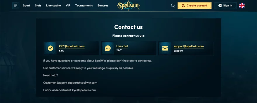 Agenti zákaznické podpory jsou přátelští a ochotní pomoci, ale odpovědi mohou být někdy generické a méně konkrétní, což může být frustrující při složitějších dotazech. Přesto základní problémy a dotazy řeší rychle a efektivně. SpellWin Casino bohužel nenabízí telefonickou podporu ani možnost zpětného volání. Kromě live chatu lze využít e-mailovou podporu, kde je dostupná i speciální adresa pro finanční záležitosti (kyc@spellwin.com).