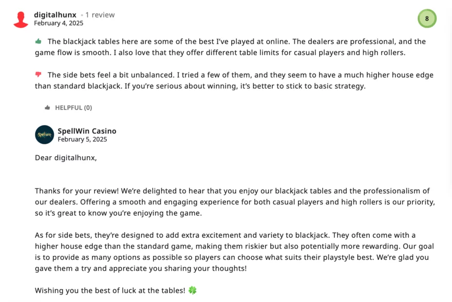 V současné době nejsou na hlavních fórech nebo recenzních webech hlášeny žádné závažné stížnosti na SpellWin Casino, což naznačuje pozitivní reputaci při řešení hráčských problémů. Transparentní komunikace a proaktivní přístup k problémům dále posilují důvěryhodnost casina. Na webu AskGamblers získalo casino hráčské hodnocení 8/10.