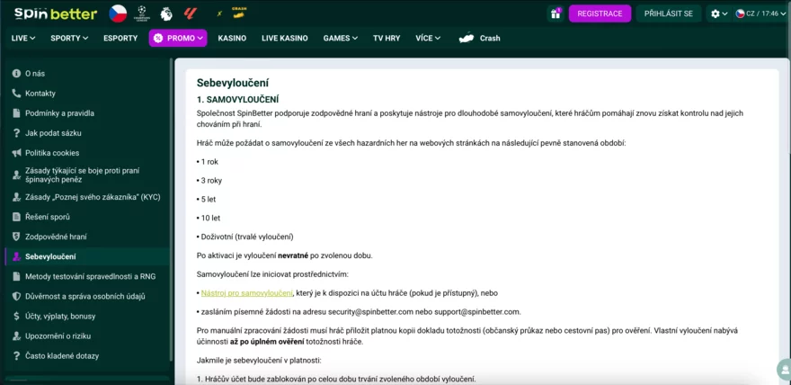 Pokud cítíte, že už je toho na vás moc, Spinbetter umožňuje dočasně nebo trvale sám sebe vyloučit z hraní. Můžete si zvolit období (např. 1 měsíc, 6 měsíců, rok), po které nebudete mít přístup k účtu, nebudete moci hrát ani vkládat. Sebevyloučení je radikální, ale účinný krok, jak zabránit rozvoji případné závislosti.