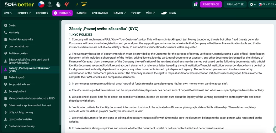 Aby byla vaše Spinbetter registrace kompletní, je potřeba projít ještě procesem ověření identity hráče neboli KYC (Know Your Customer). Tento krok obvykle přijde na řadu před prvním výběrem peněz z účtu. Casino si tím ověřuje, že jste skutečně tou osobou, za kterou se vydáváte, a že máte nárok transakci provést.