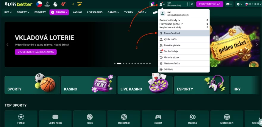Přejděte do sekce „Proveďte Vklad“. Po přihlášení klikněte v horní nabídce na tlačítko vkladu, nebo na svůj profil a vyberte možnost „Proveďte vklad“.