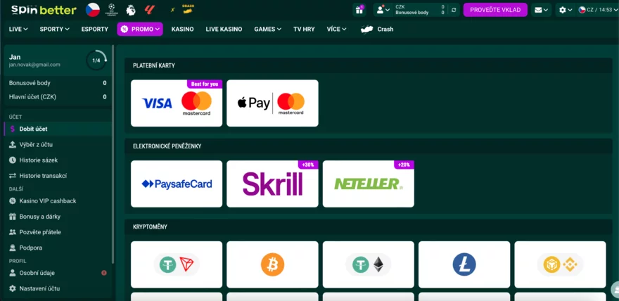 👉 Podrobnosti o platebních metodách a limitech najdete v naší komplexní Recenzi Spinbetter casina!
