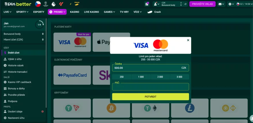 Zvolte platební metodu. Casino Spinbetter nabídne seznam dostupných metod vkladu. Vyberte si tu, která vám vyhovuje – například platbu kartou, přes Skrill nebo vklad pomocí kryptoměny.