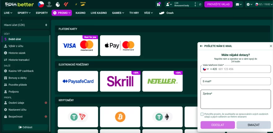 Nabídka metod se může lišit podle země a aktuální situace. Pokud například nevidíte v seznamu PayPal nebo jinou metodu, kterou byste rádi použili, je pravděpodobně pro ČR nedostupná. V takovém případě zvolte alternativu – Spinbetter nabízí dostatek jiných možností.