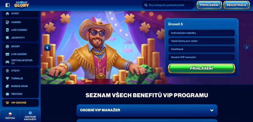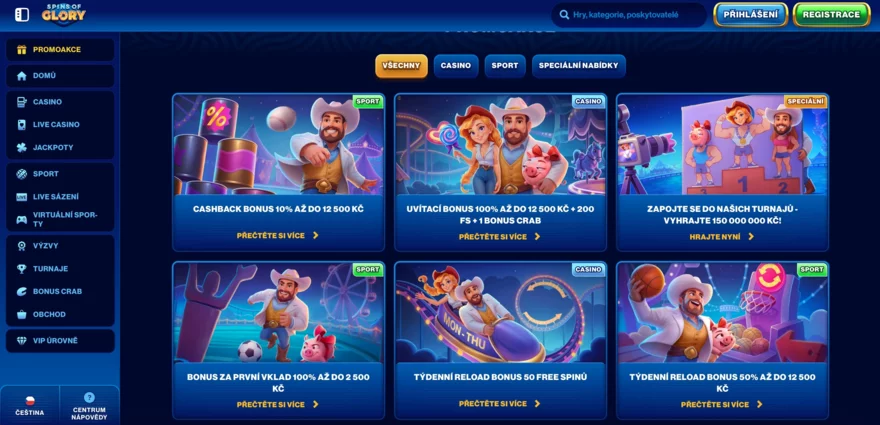 Spins of Glory Casino nabízí plně lokalizované prostředí pro české hráče, včetně webu v češtině, podpory české koruny (CZK) a možnosti vedení účtu v této měně. To výrazně zjednodušuje orientaci v podmínkách, bonusových pravidlech i komunikaci s podporou.