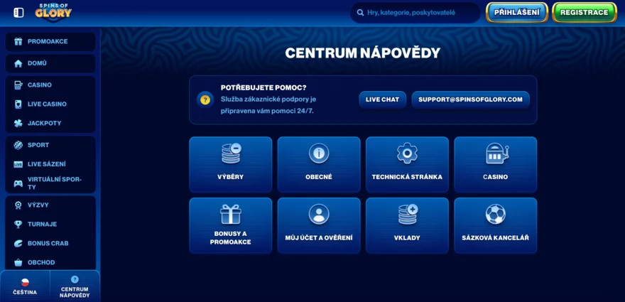 Spins of Glory nabízí zákaznickou podporu dostupnou 24/7 na více kanálech, což je pro hráče klíčové při řešení naléhavých problémů. Nejrychlejší možností je live chat, kde je reakční doba do několika minut a operátoři působí profesionálně a ochotně. Pro složitější dotazy (např. ověření účtu nebo reklamace) je lepší využít e-mailovou podporu, kde však odpověď může trvat až 24 hodin. Podpora nabízí služby i v češtině, což je pro české hráče velkou výhodou.