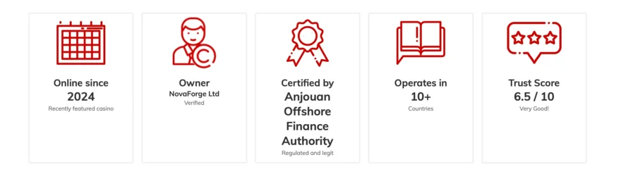 Casino Spins of Glory vstoupilo na trh v roce 2024 pod hlavičkou společnosti NovaForge Ltd a získalo licenci od Anjouan Gaming Authority.