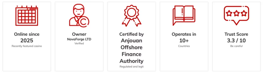 SpyBet je nové online casino spuštěné v roce 2025, které působí pod hlavičkou renomované společnosti NovaForge LTD. Ta provozuje desítky dalších online platforem a má bohaté zkušenosti s hazardním průmyslem. Důležitým aspektem důvěryhodnosti je platná licence vydaná Anjouan Offshore Finance Authority, která sice není tak přísná jako například maltská nebo britská, ale přesto stanovuje jasná pravidla pro férové hraní a ochranu hráčů.
