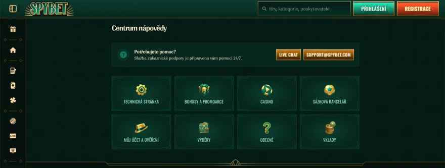 SpyBet Casino nabízí zákaznickou podporu, která je dostupná nonstop – 24 hodin denně, 7 dní v týdnu. Nejefektivnějším způsobem, jak získat odpovědi na své dotazy, je live chat, který najdete přímo v centru nápovědy. Odpovědi obvykle přicházejí během několika minut, ať už řešíte otázky kolem bonusů, plateb nebo technických zádrhelů. Pokud zrovna nejste ve spěchu, můžete využít i e-mailovou podporu na adrese support@spybet.com, která je rovněž k dispozici 24/7 a odpověď zpravidla obdržíte do 24 hodin.