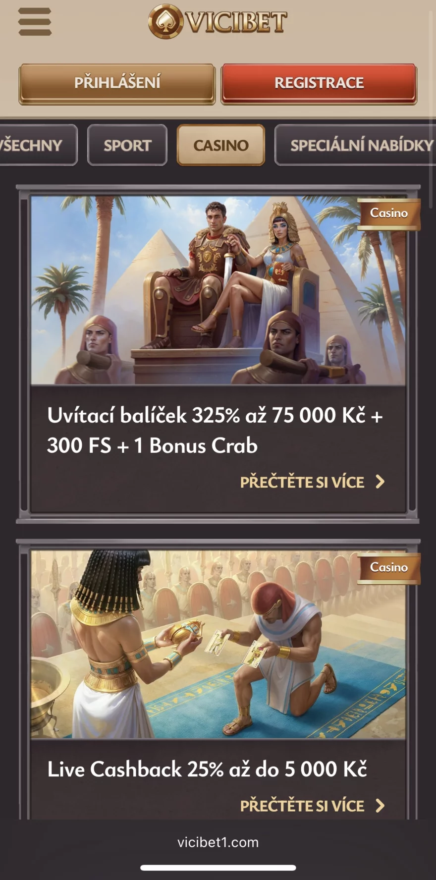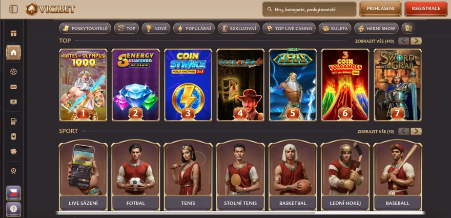 Sekce Live Casina nabízí autentický zážitek díky živým krupiérům. Můžete se připojit k řadě stolů pro blackjack, ruletu, baccarat, poker a také k různým zábavným live gameshow. Streamy běží ve vysoké kvalitě a hraní je plynulé, bez znatelných záseků. Co se týče celkového vzhledu webu, Vicibet sází na tematiku starověkého Egypta – pozadí a grafické prvky evokují pyramidy, Kolosea a faraony. Zároveň design neubírá na funkčnosti – stránky jsou rychlé a spolehlivé, vše se načítá svižně a ovládání je intuitivní. Celkově lze tedy casino hodnotit velmi pozitivně co se týče toho, jak Vicibet funguje z pohledu uživatele, včetně uživatelského rozhraní a procesů.