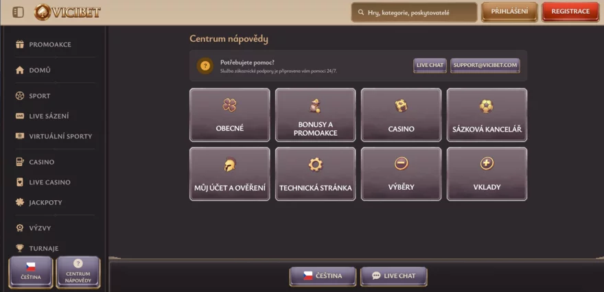 Zákaznická podpora Vicibetu je dostupná 24/7. Nejrychleji se spojíte přes live chat, který je k dispozici přímo na webu – odpověď od operátora jsme obdrželi vždy do jedné minuty. Personál je profesionální a vstřícný; ve špičce je dostupná podpora i v češtině, jinak se bez problému domluvíte anglicky. K dispozici je také kontaktní e-mail na adrese support@vicibet.com (odpověď obvykle do 24 hodin). Celkově je zákaznický servis velmi kvalitní a dotazy řeší rychle a korektně.