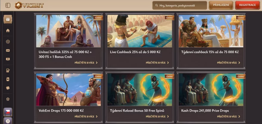 Vicibet Casino je relativně nové online casino založené v roce 2025 s výraznou egyptskou tématikou, které si rychle získává pozornost hráčů z celého světa - a to včetně Česka. Na první pohled zaujme pestrobarevným designem rozhraní inspirovaným faraonskými motivy a obří nabídkou her. Stránka působí moderně a uživatelsky přívětivě, s přehlednou navigací a bleskovou rychlostí načítání. V této recenzi se zaměříme na bonusové nabídky, herní katalog, bezpečnost, mobilní hraní, platební metody a zákaznickou podporu.