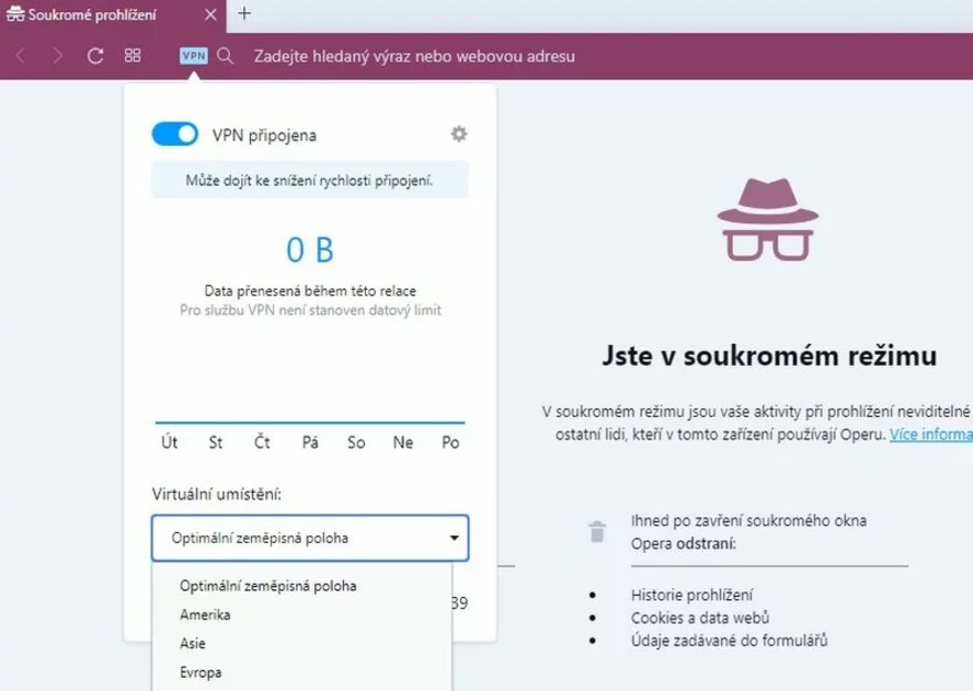 Další variantou VPN, která je zdarma, není nic obyčejnějšího než internetový prohlížeč Opera. Konkrétně v anonymním režimu tohoto internetového prohlížeče je zabudovaná VPN zdarma. Stačí zaktivovat a vybrat, zda chcete být přesměrováni do Evropy, Asie nebo do Ameriky. Bohužel si zde nejde předem nastavit zemi, do které chcete být přeneseni.