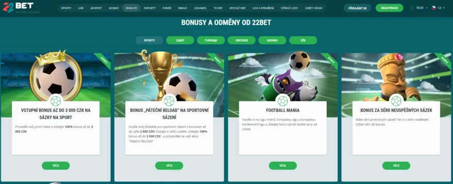 Sázková kancelář 22Bet je známá svou štědrou nabídkou bonusů a promoakcí, které osloví jak nové, tak stávající hráče. Platforma nabízí atraktivní uvítací bonus, pravidelný reload bonus a další speciální akce, které zvyšují hodnotu každé sázky.